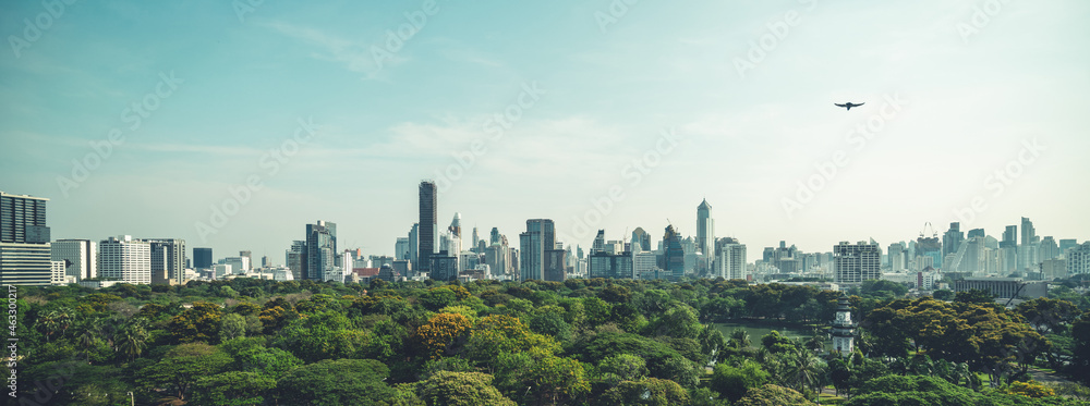 Public park and high-rise buildings cityscape in metropolis city center . Green environment city and downtown business district in panoramic view .
