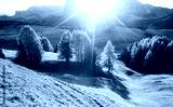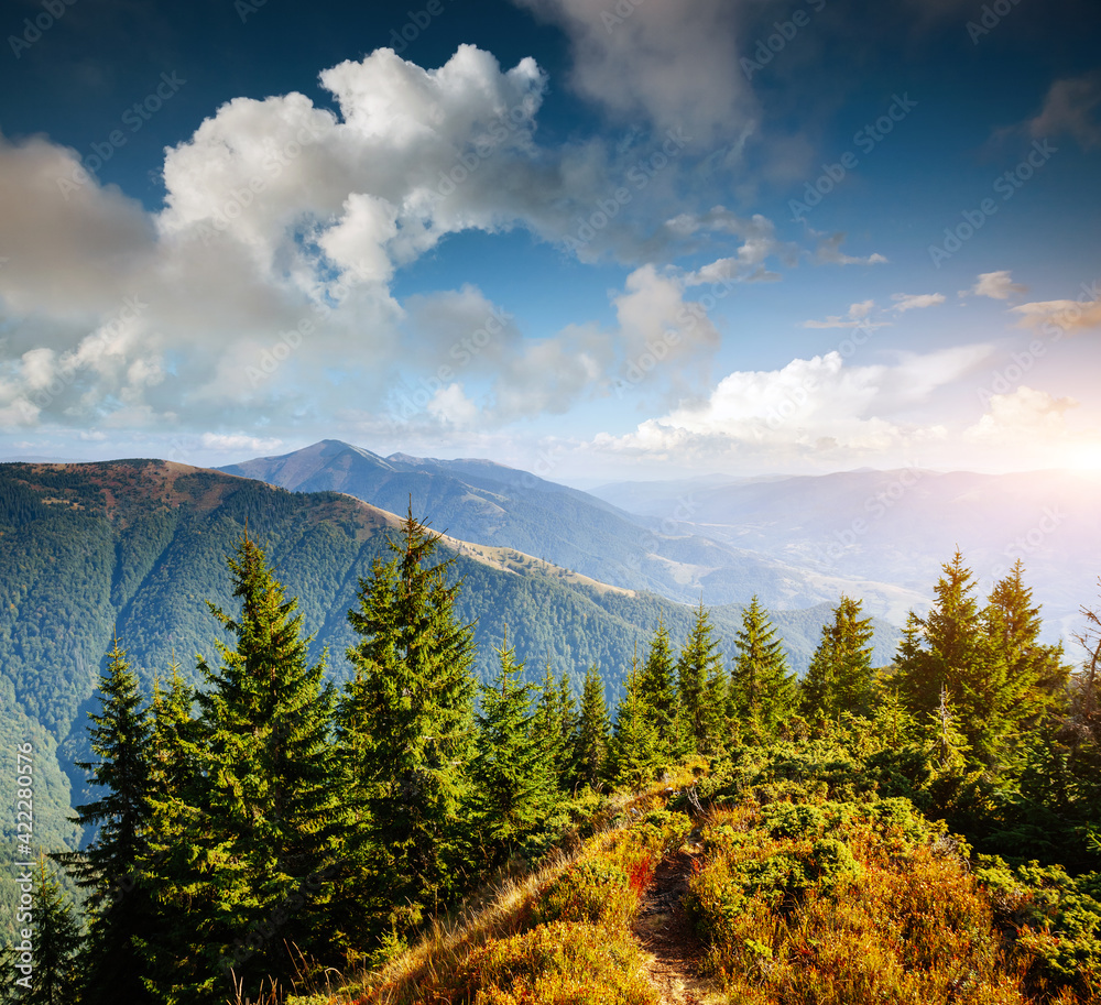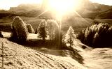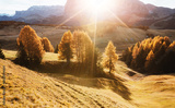 Lovely yellow larches in sunlight. Location place Dolomiti, Compaccio village, Alpe di Siusi, Province of Bolzano - South Tyrol, Italy, Europe.