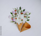 Lovely bouquet flower in ice cream cone on white background. Floral arrangement, flat lay styling. Top view.