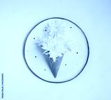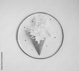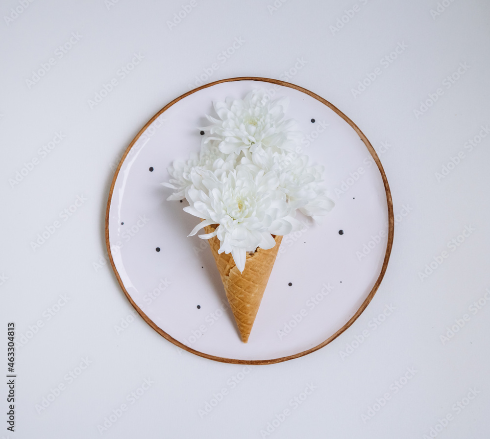 Lovely bouquet flower in ice cream cone on white background. Floral arrangement, flat lay styling. Top view.