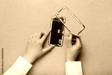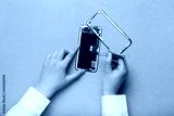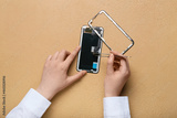 Female technician repairing damaged mobile phone on color background