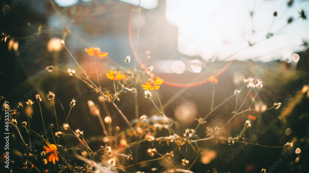 夕日に照らされる花々