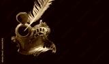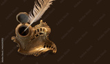 Decorative copper inkwell with nib for writing on black background, top view
