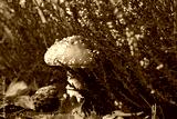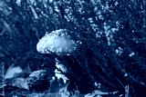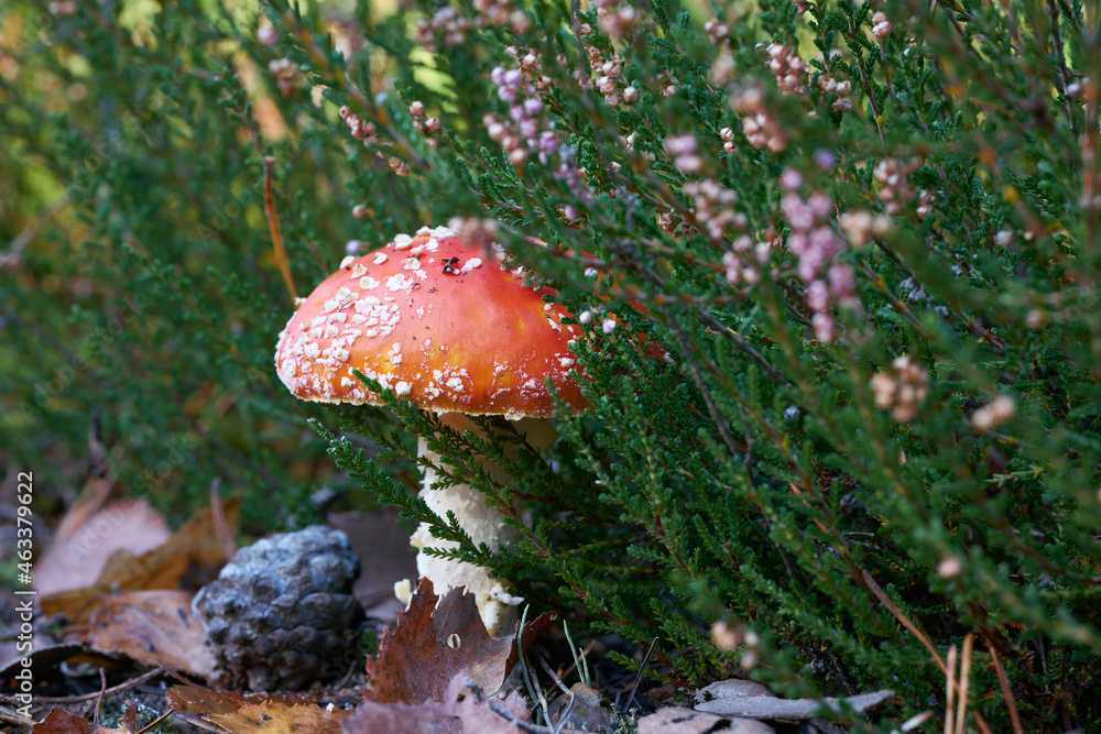 Toadstool (Amanita muscaria) grow on the forest floor in autumn