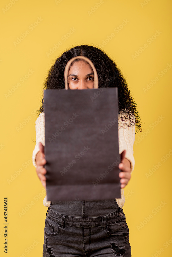 Mujer con una bolsa de papel en sus manos viendo a cámara
