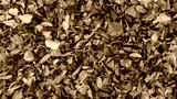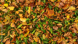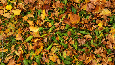 Autumn leaves on green grass. Yellow, orange linden leaves lying on the ground. Fallen foliage in the forest. Leaf fall season. Top view, flat lay.