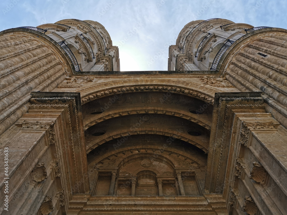 Facade of Renaissance Cathedral - Roman Catholic Church in the city of Malaga, constructed between 1528 and 1782. Costa del Sol, Andalusia, Spain.