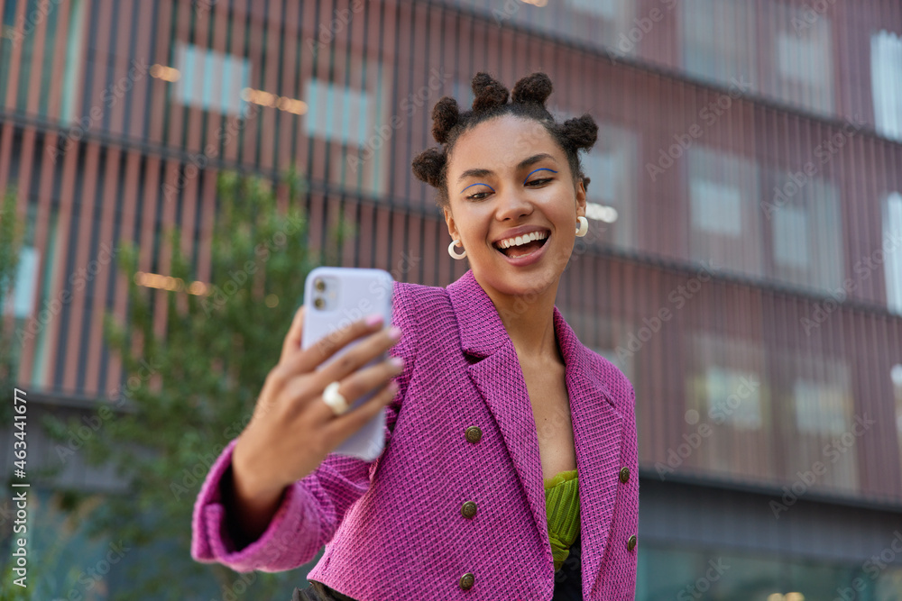 Positive carefree girl with toothy smile takes selfie on smartphone poses against modern urban building dressed in stylish pink jacket records video and talks with followers. Adolescence technology