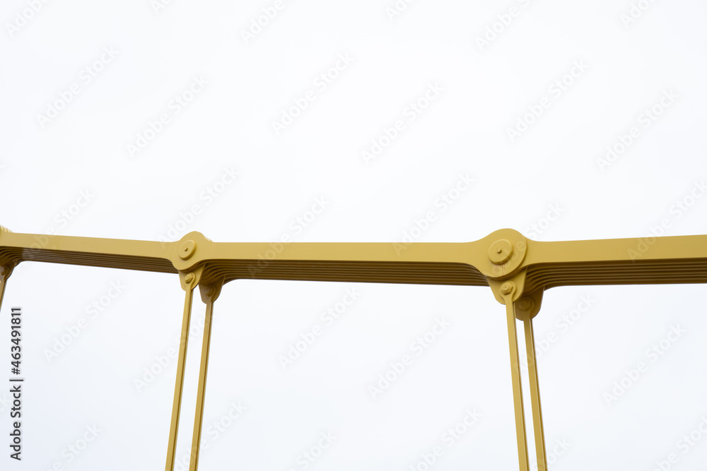 Isolated view of joints and cables from a self anchored suspension bridge painted bright yellow, horizontal aspect