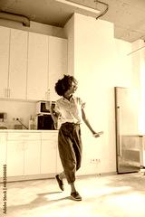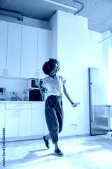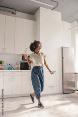 Full-length photo of smiling Afro American lady using headphones and dancing on the kitchen while holding smartphone