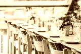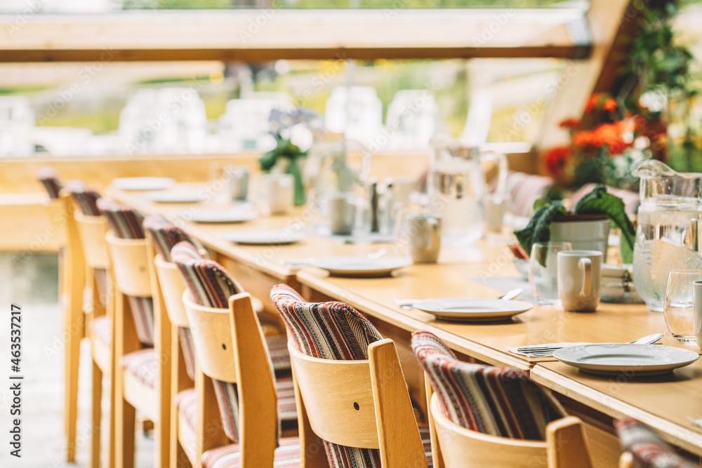 Cozy Interior Of Summer Cafe. Jug Of Water On Table And Cutlery Laid Out