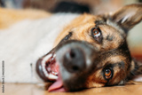 Bored Dog Is Lying On Floor Of A House. Portrait Of Pet Tired Of Heat
