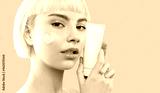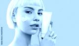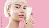 Modern sensual attractive young woman with cream on ideal smooth cheek skin hold mockup jar or tube advertising healthy skincare moisturizing beauty product. Blond woman shows template cosmetic bottle