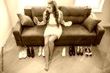 The woman thinks about which shoes to choose. Gray sofa. Lots of different shoes.