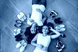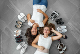 Two women are lying on the floor. Lots of women's shoes. Top view.