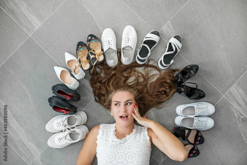 Happy girl lies on the floor between shoes. Top view.