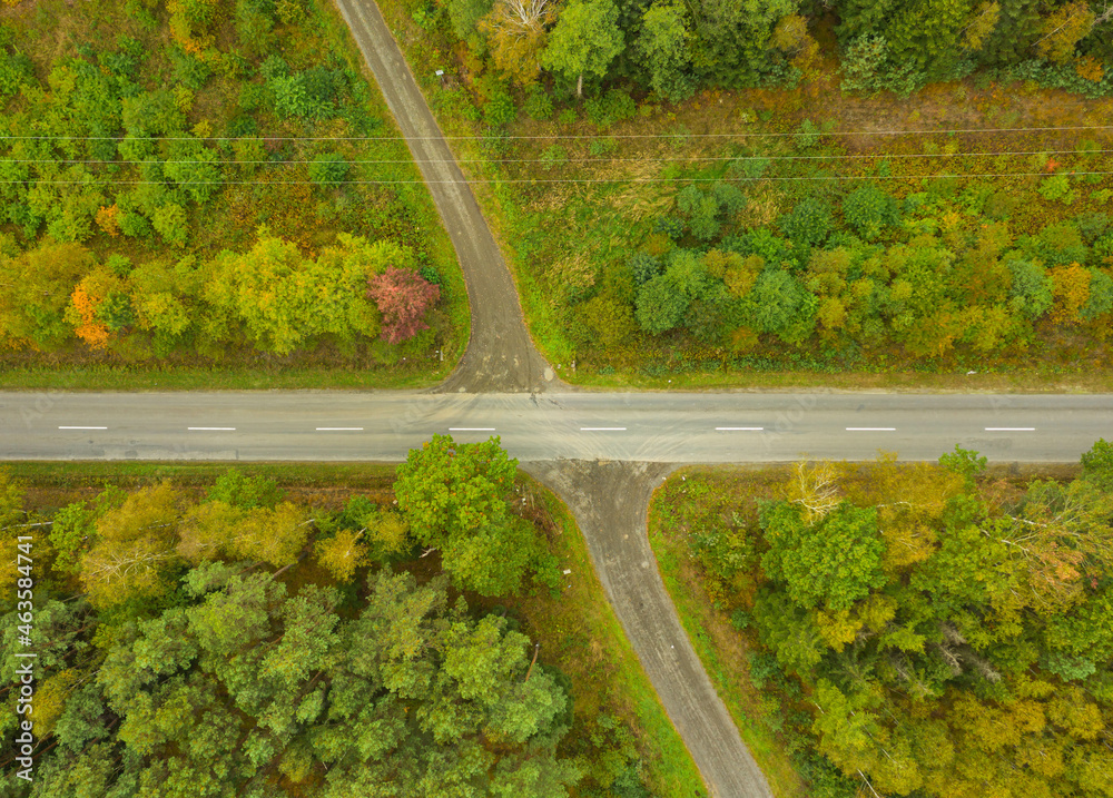 Skrzyżowanie drogi asfaltowej z drogą leśną. Widok z drona.