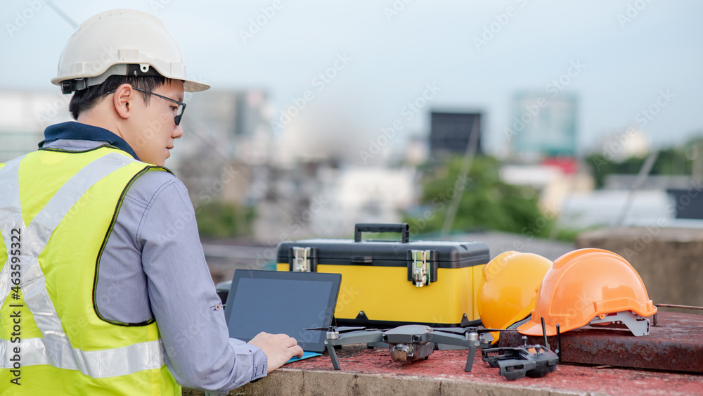 Asian engineer man working with drone, laptop and working tools at construction site. Male worker using unmanned aerial vehicle (UAV) for land and building site survey in civil engineering project.