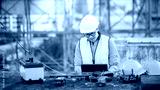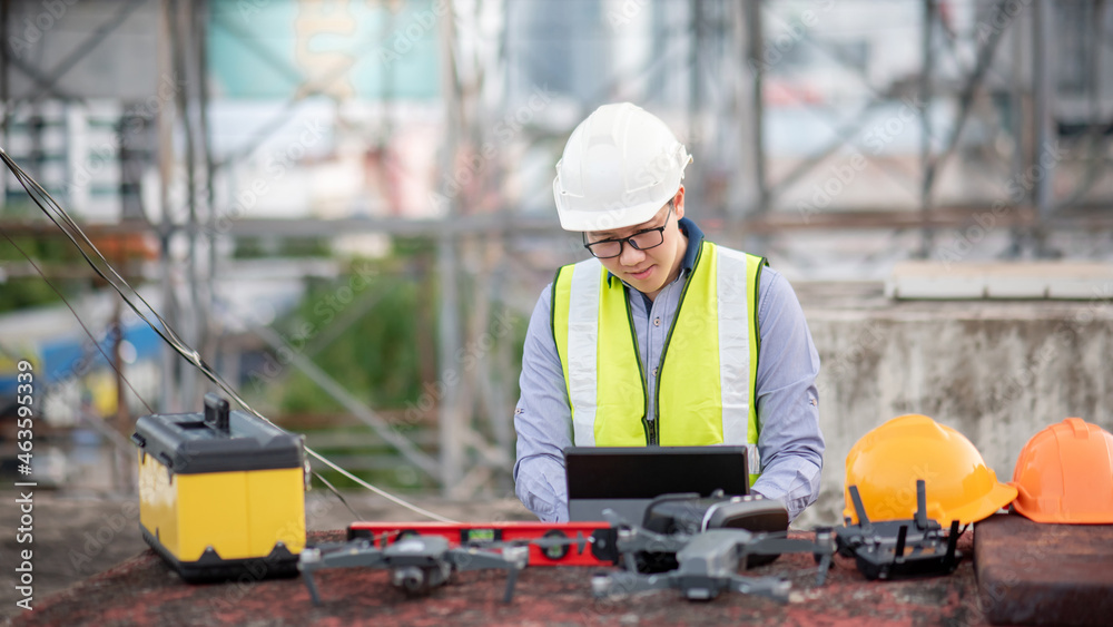 Asian engineer man working with drone, laptop and working tools at construction site. Male worker using unmanned aerial vehicle (UAV) for land and building site survey in civil engineering project.