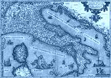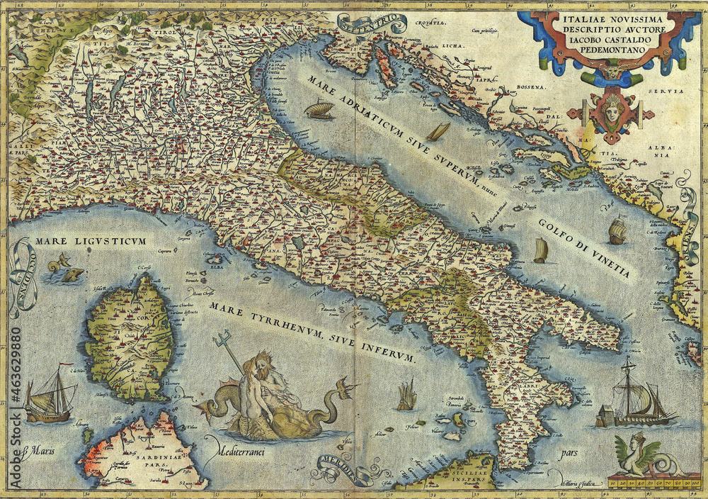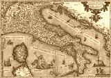 Old vintage colorful 16th-century map of Italy showing Corsica and the western coast of the Balkans