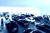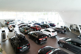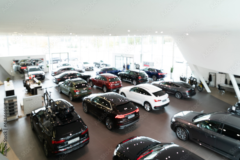 Blurred background of new cars displayed in luxury showroom, panorama