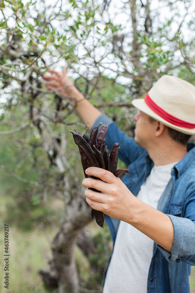 Farmer holding in hands ripe carob pods during harvesting season