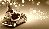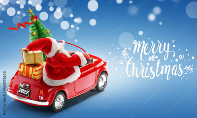 Merry Christmas card. Santa Claus driving red car with gift boxes and Christmas tree on blue background.