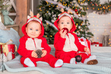 twins toddlers in red santa's reindeer suits sit next to each other at home against the background of christmas tree