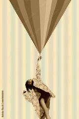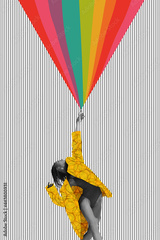 Contemporary art collage of beautiful female dancer in yellow drawn jacket touching rainbow element. LGBTQIA support