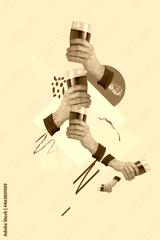 Contemporary art collage of three human hands holding beer glasses isolated over yellow background