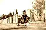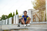 Young woman sitting on skateboard in the city