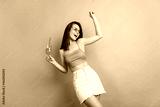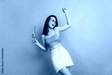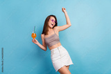 Photo of joyful young positive woman hold hands cocktail dance weekend vacation isolated on blue color background