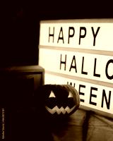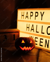 Head Jack Pumpkin with Scary Smile and Burning Candles for Party Night, 31 October and Tablet with Text Happy Halloween