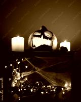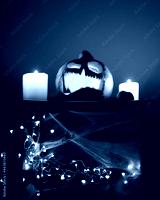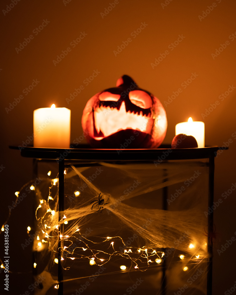 Head Jack Pumpkin with Scary Smile and Candles for Party Night on Black Background, Halloween Concept