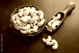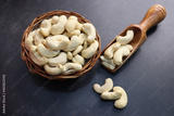 Tasty Cashew nuts in a mini wooden basket on the back background. Goan Kaju. Copy space. Dry fruits background or festivals banners. Diwali gift concept.