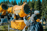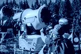 Repair man shows point finger on a snow making machine in the wood. Huge device. Control. Check. Nature. Electricity. Power