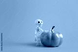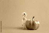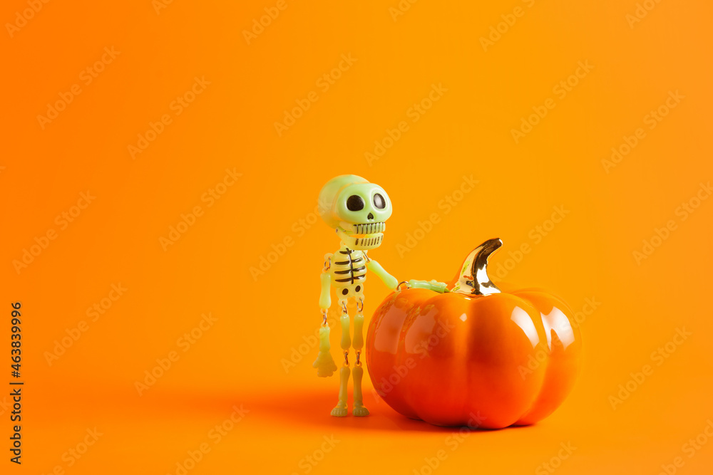 Cheerful toy skeleton with big pumpkin on orange background with copy space.