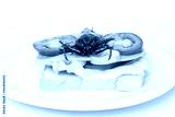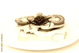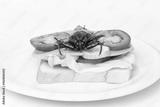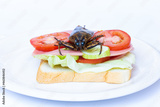 Close up toast with fried Giant Water Bug - Lethocerus indicus, fresh vegetables and salami.