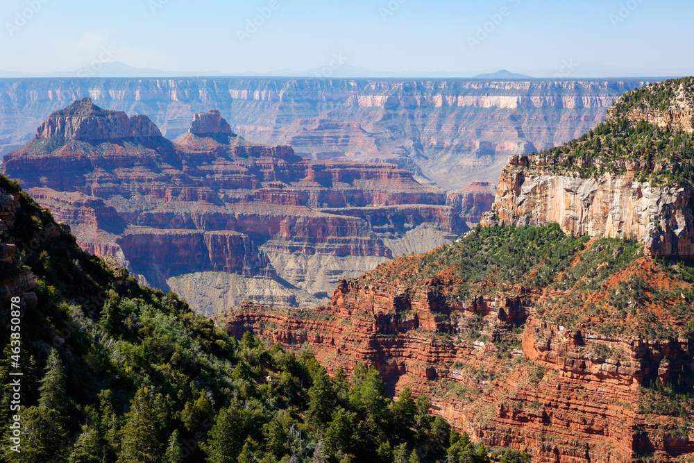 Grand Canyon layered landscape view from north rim on a hot summer day.