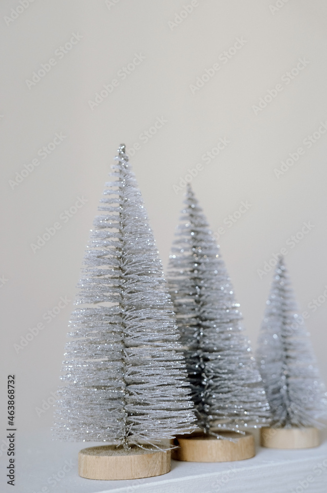 Selective focus tiny Christmas trees on a white background. Snowy silver fir trees. Christmas minimal card.