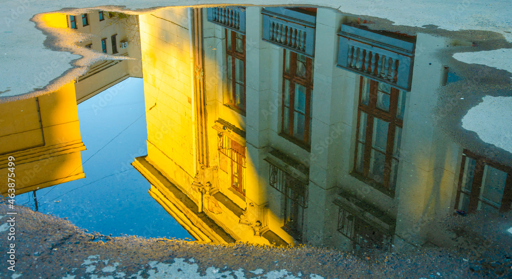 Reflection of a multi-storey building in a puddle after rain.