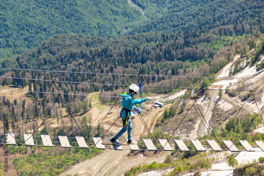 Young boy walks on a suspension bridge at Caucasian mountains. Rosa peak, spring. Sochi, Krasnaya polyana.