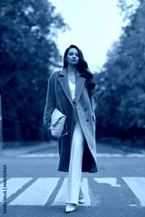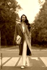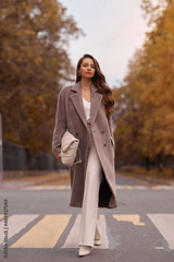 Elegant brunette woman with long wavy hair wearing grey wool coat, holding white handbag and walking at city street on autumn day. Portrait against yellow leaves