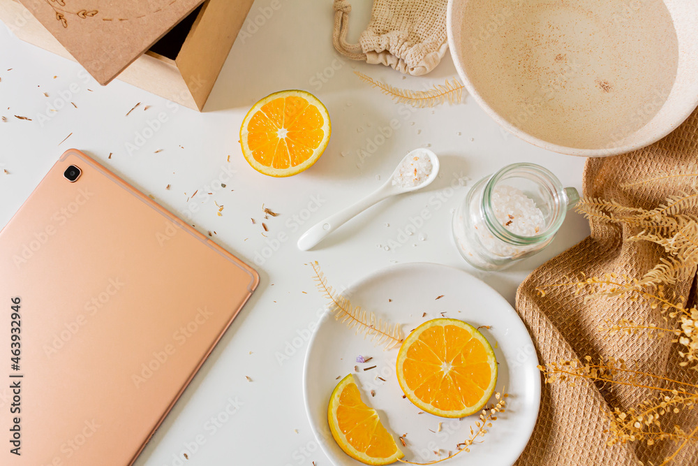 wooden box, bowl with water, orange slices, tablet and bath salt on white background. Flat lay, top view. Female beauty treatment routine concept.