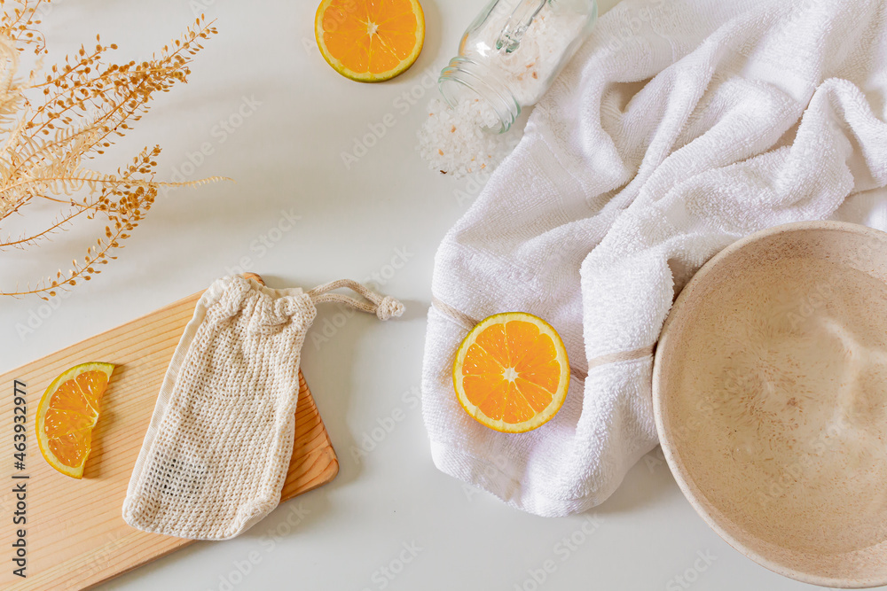 Beauty spa beige composition with towel, orange slices, bowl with water, cotton bag on white background. Flat lay, top view. Female beauty treatment routine concept.