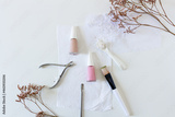 Health care spa concept. Mock up with nail polish, nail cutters, bath salts and dried flowers on white background. Flat lay, top view. Beauty, lifestyle, skin care, composition.