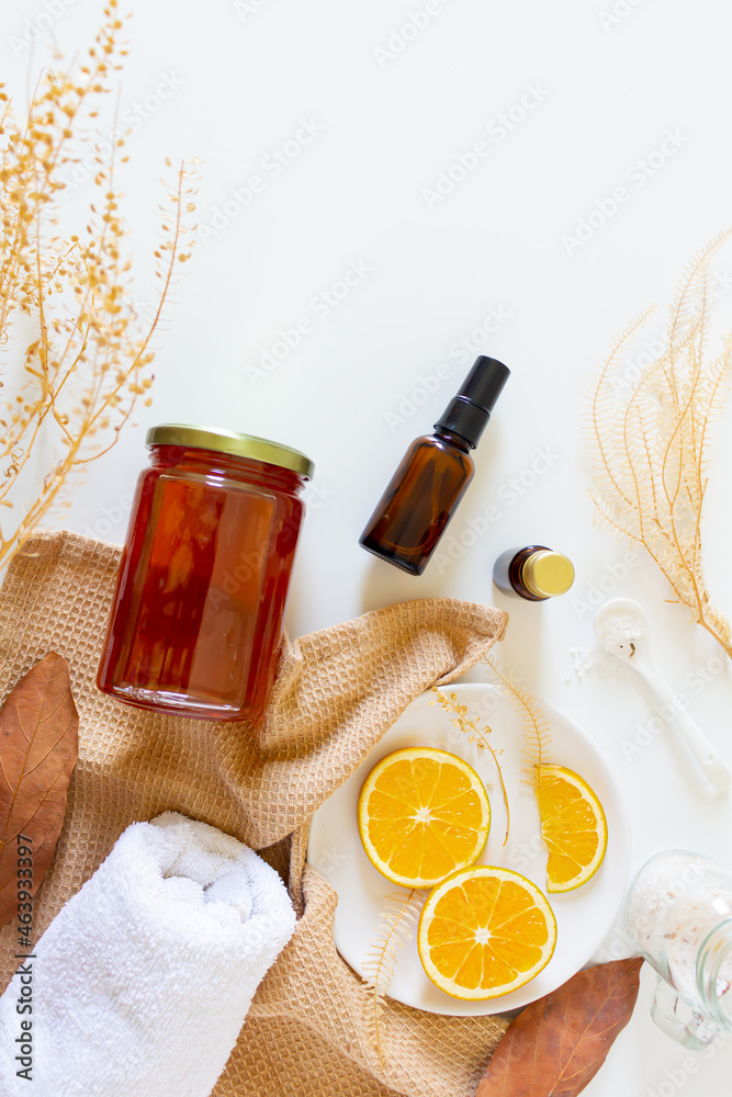 Health care spa concept. Mock up with amber bottle, orange slices, honey, nail polish, bowl with water and towel on white background. Flat lay, top view. Beauty, lifestyle, skin care, composition.