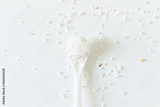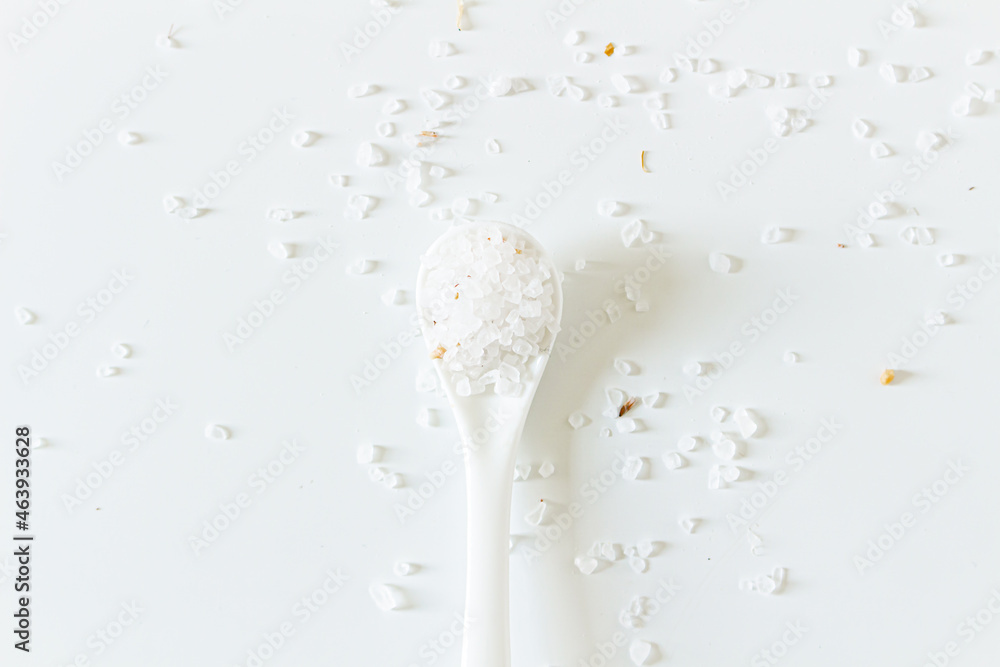 Health care spa concept. Mock up with spoon with bath salts on white background. Flat lay, top view. Beauty, lifestyle, skin care, composition.