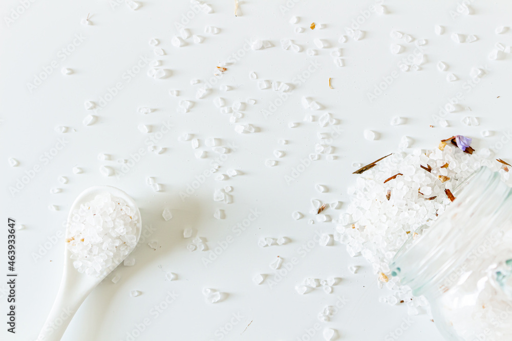 Health care spa concept. Mock up with spoon and glass bottle with bath salts on white background. Flat lay, top view. Beauty, lifestyle, skin care, composition.