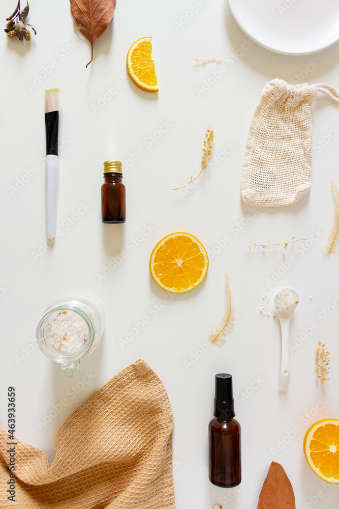 Healthcare spa concept. Mock up with dried leaves, orange, cotton bag, bottles and bath salts on white background. Flat lay, top view. Beauty, lifestyle, skin care, composition.